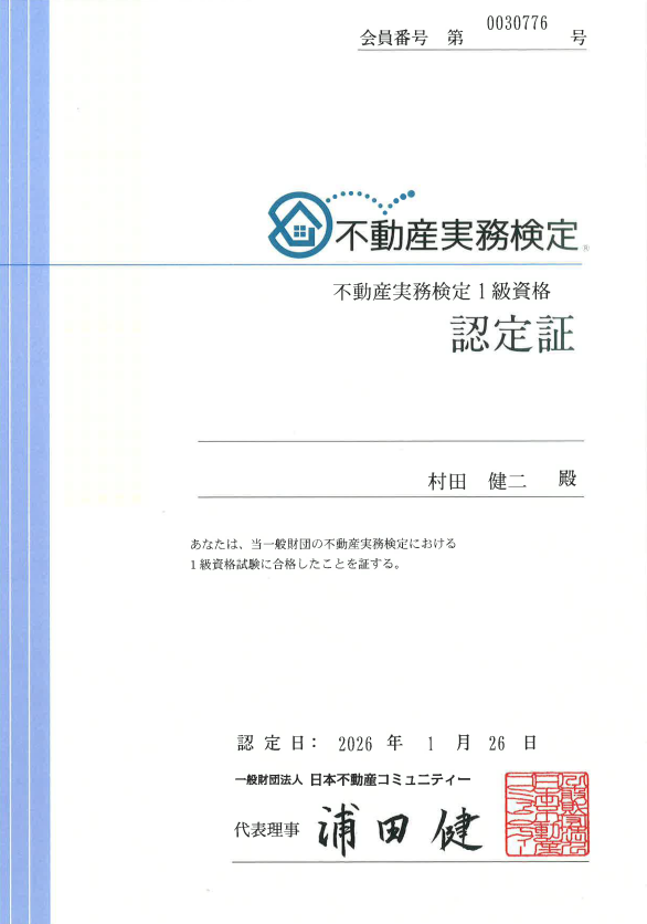 このたび、代表税理士 村田健二は、一般財団法人 日本不動産コミュニティーが認定する「不動産実務検定1級」に合格いたしました。